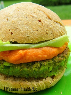 Finally , my entry of serene green Vegan Edamame Burger with Red Pepper Hummus.